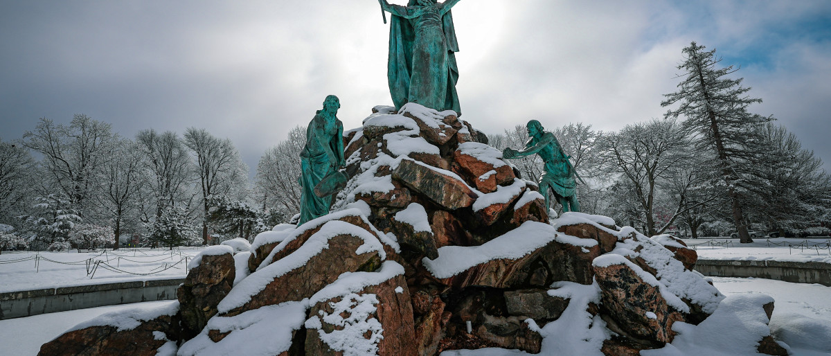 The King Memorial Fountain. Also known as the Moses Fountain, this majestic monument features a statue of Moses obtaining water from the rocks of Mount Horeb. Four figures surrounding the rocks represent infancy, youth, adulthood, and old age. During tulip season, the flower beds around the fountain dazzle with color and serve as the centerpiece of the annual Tulip Festival.